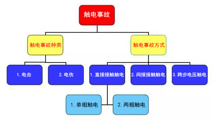 人體不同部位接觸不同電位則有電流流過(guò)為觸電。分為“電擊”與“電傷”兩類。