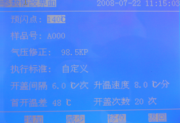 1)在此界面中預閃點、樣品號、氣壓、標準和時間,都可按提示進行調(diào)整,修改完成后按【返回】鍵。回到主操作界面。