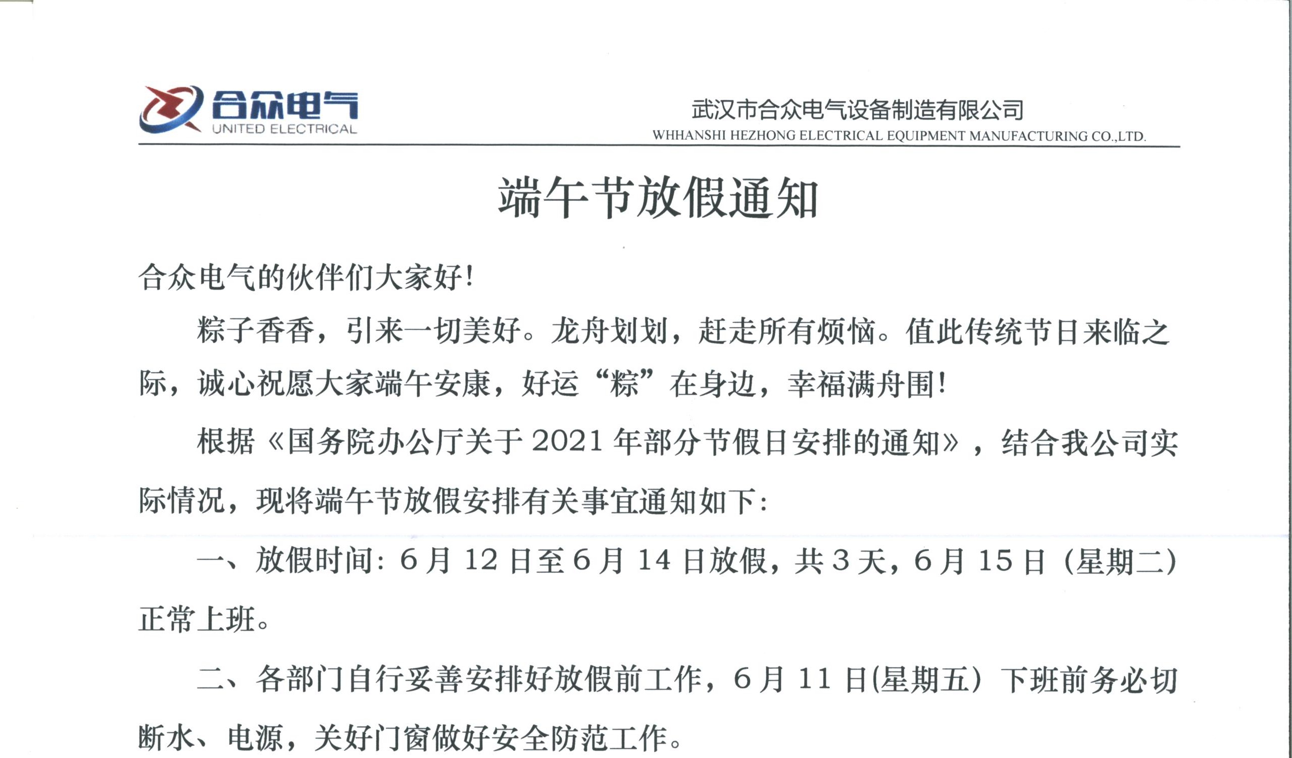 端午安康 武漢市合眾電氣端午節放假通知